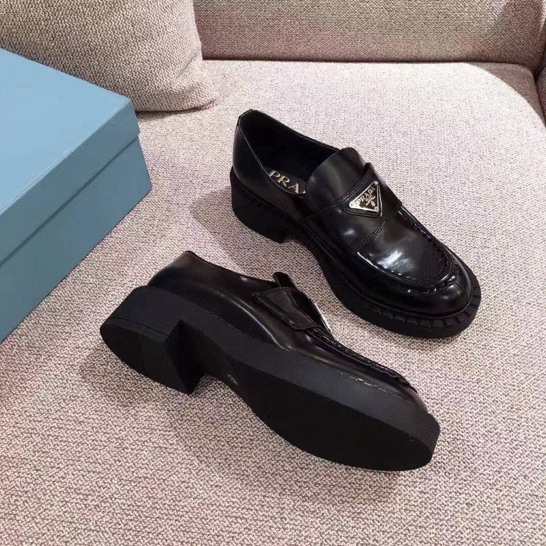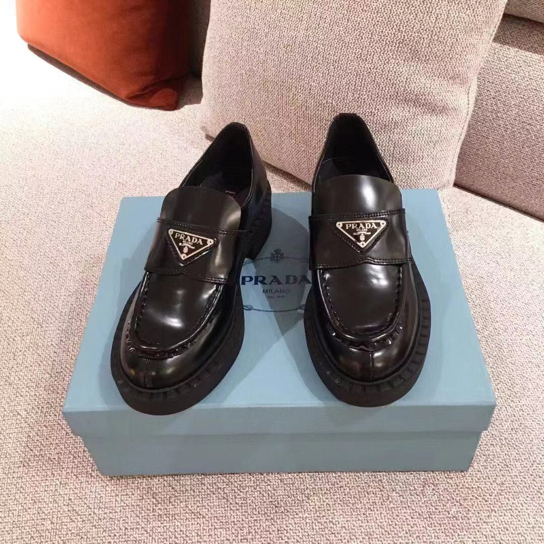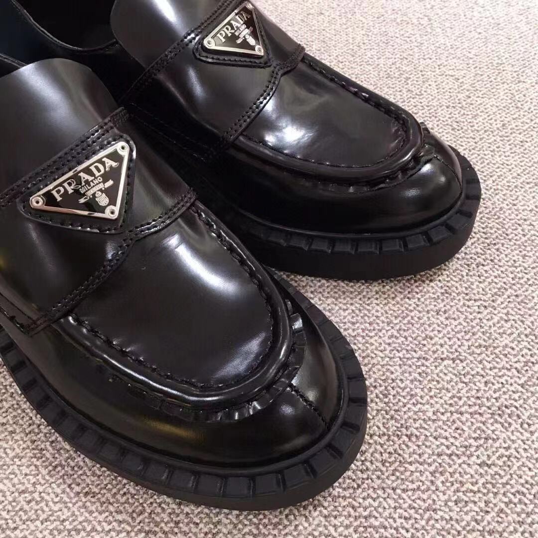 PRADA 프라다 초콜렛 트라이앵글 로고 브러쉬드 로퍼 블랙 1D246M > 신발